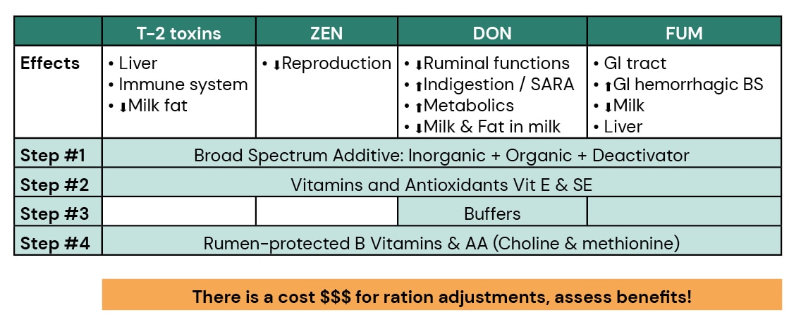 Die negativen Auswirkungen von Mykotoxinen hängen von der Art der vorhandenen Toxine, der Dauer der Exposition und dem Grad der Kontamination sowie von anderen externen Management- und Umweltfaktoren ab. Die Verunreinigung kann durch eine Anpassung der Futtermittelformulierung verringert werden, aber derartige Vorteile können durch Beschränkungen des Futtermittelbestands eingeschränkt werden. Die Zugabe eines Futtermittelzusatzes mit breitem Wirkungsspektrum zur Bekämpfung von Mykotoxinen könnte die Leistungseinbußen verringern und die Tiergesundheit verbessern, aber solche Produkte werden die Probleme im Zusammenhang mit schlechtem Kuhkomfort oder inkonsequentem Management nicht lösen.