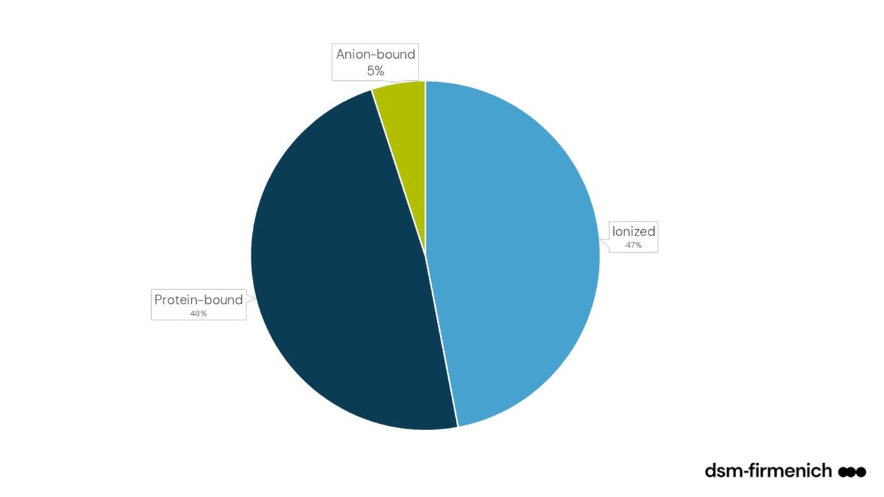 Mehr als 99 % des gesamten Körperkalziums von Vögeln (und auch von Säugetieren) befindet sich im Skelett. Die restlichen 1 % verteilen sich auf den extrazellulären und den intrazellulären Pool. Intrazelluläres Kalzium ist an der Zellteilung, der Muskelkontraktion, dem Glykogenstoffwechsel und anderen wichtigen Funktionen beteiligt. Das zirkulierende extrazelluläre Kalzium ist für die Knochenmineralisierung, die Blutgerinnung und als Kofaktor für verschiedene Enzyme erforderlich. Dieses zirkulierende extrazelluläre Kalzium wird als Gesamtkalzium im Blut gemessen, und der Normalbereich für Masthühner liegt bei 11,5-12,5 mg/dl. Das zirkulierende extrazelluläre Kalzium liegt jedoch in drei verschiedenen Formen vor: ionisiertes Kalzium (etwa 47 %), proteingebundenes Kalzium (etwa 48 %) und anionengebundenes Kalzium (etwa 5 %).