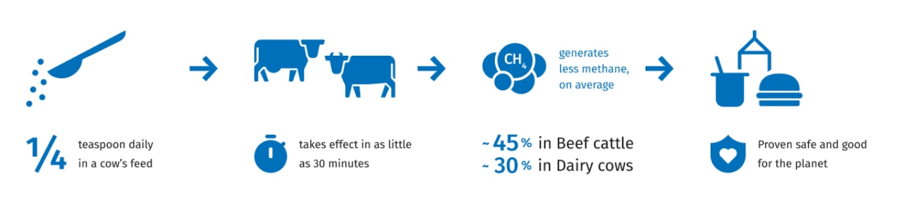 Bovaer® ist ein Futtermittelzusatzstoff, der die Methanemissionen im Darm reduziert und damit zu einer deutlichen und unmittelbaren Verringerung des ökologischen Fußabdrucks von Rindfleisch und Milchprodukten beiträgt. Es ist die bisher am umfassendsten untersuchte und wissenschaftlich bewiesene Lösung für das Problem des aufgestoßenen Methans.