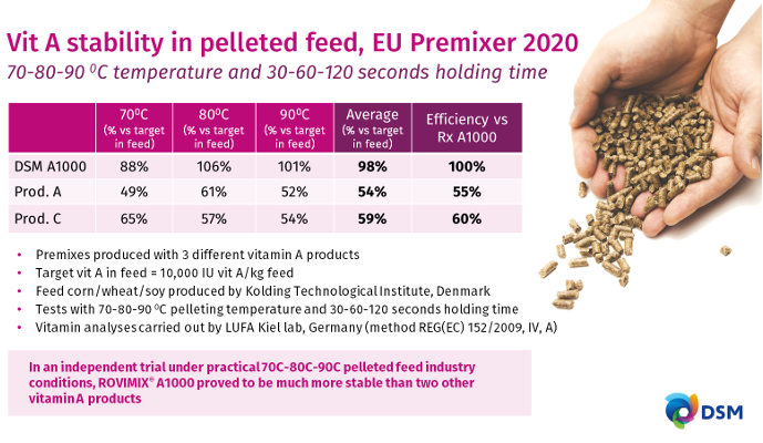 Das bedeutet nicht, dass die Vitamin A-Formen nicht an Aktivität verlieren. Es gibt sie, wie zu EMQ-Zeiten, aber mit der richtigen Produktform (ROVIMIX® A1000) ist der Aktivitätsverlust unter milden Bedingungen vernachlässigbar, und unter wesentlich belastenderen Bedingungen, wie z. B. einer vollständigen Vormischung mit Cholinchlorid und Spurenelementen mit langer Lagerzeit, sind die potenziellen Verluste minimiert und viel geringer als bei anderen Vitamin A-Produkten.