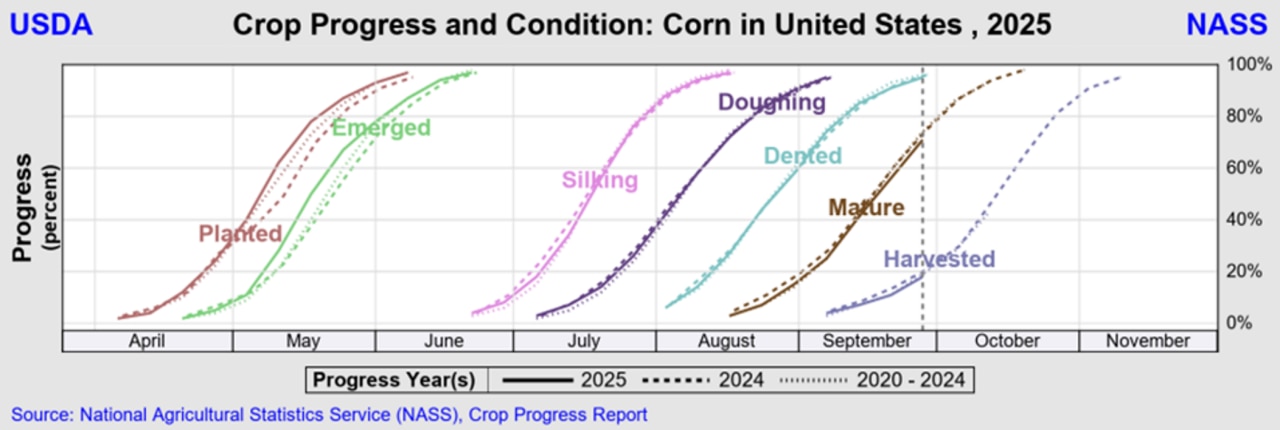 1. United States Department of Agriculture. (2025, September 28). 2025 Crop Progress and Conditions: Corn in United States, 2025. USDA National Agricultural Statistics Service. Retrieved October 1, 2025, from https://www.nass.usda.gov/Charts_and_Maps/Crop_Progress_&_Condition/2025/index.php
