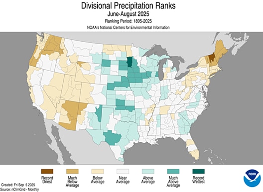 Figure 3. NOAA National Centers for Environmental Information Divisional Precipitation Ranks June-August 2025 (Period 1895-2025).2