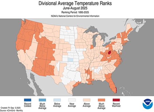 Figure 2. NOAA National Centers for Environmental Information Divisional Average Temperature Ranks June-August 2025 (Period 1895-2025).2