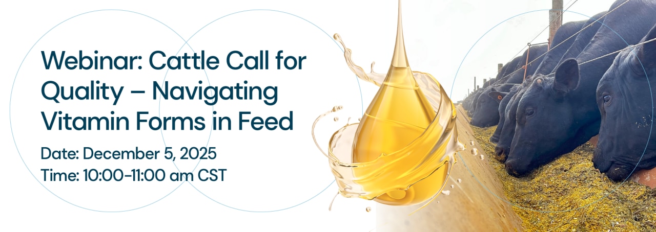 Considering the impact of vitamin nutrition on health and performance of cattle, it’s essential to include a stable vitamin formulation in the ration that continuously provides the required and intended vitamin level regardless of supplementation form, physical and chemical characteristics of feed ingredients or ambient and storage conditions. Join us for this live webinar exploring the different product forms available for vitamin supplementation in cattle feed, with special emphasis on dispersible liquid concentrates, a convenient method to supplement vitamins in especially liquid feed applications providing ease of use and peace of mind.