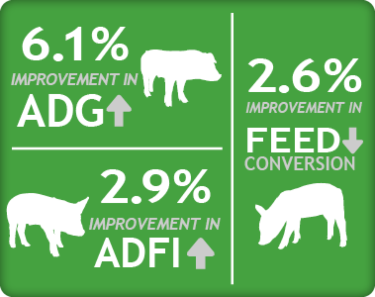 Since 2013, VevoVitall® has been studied in 10 individual trials in over 4,000 pigs. Parameters evaluated include average daily gain, average daily feed intake and feed to gain. VevoVitall® consistently improved performance in each area, compared to control, throughout the 10 trials when fed in starter rations at a 0.50% inclusion rate.