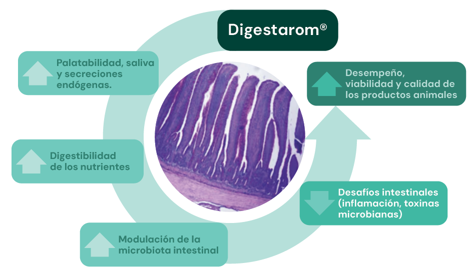 Digestarom® favorece el desarrollo del tracto gastrointestinal y puede ayudar a aliviar los efectos del estrés durante los períodos críticos de la producción y el desarrollo animal.