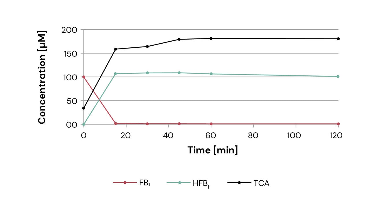 Low doses of FUMzyme® (approximately 1.7 – 17 U/L) were capable of completely degrading 72.2 ppm FB1 (100 μM). An activity of 17 U/L completely hydrolyzed FB1 within the first 15 minutes of the reaction (Figure 1)