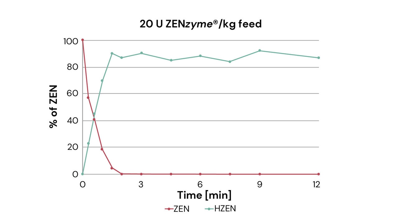 ZENzyme® is a purified enzyme that cleaves ZEN into a product with significantly reduced estrogenic activity. In animal studies, the enzyme effectively prevented the absorption of ZEN into the bloodstream, thereby reducing reproductive risks. Regulatory approval for ZENzyme® is currently pending in the EU and the US, with promising results already demonstrated in pigs. A dose of 20 U ZENzyme®/kg feed (which corresponds to 1 kg MPL 5.Z per ton of feed) achieves complete degradation of 10 ppm ZEN within just 2 minutes of incubation as shown in Figure 2.