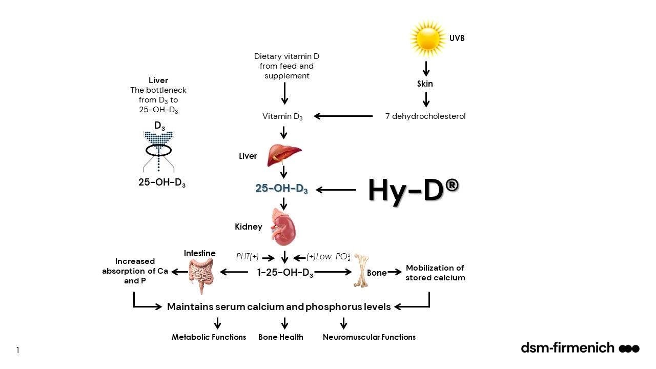 The two common ways of absorbing vitamin D are via the sun, or through feed, commonly as vitamin D3. However, there is a major limitation as to how much can a cow transform into 25-OH vitamin D3, which is later converted in the kidney into 1,25OHD3, the active form (Figure 1).