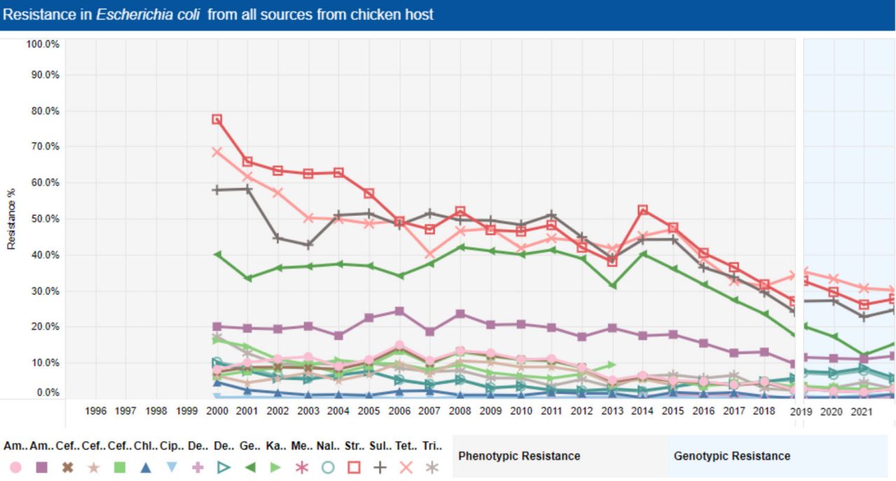 Does reducing antimicrobial use lead to the reduction of AMR? The resistance of different antimicrobials has been monitored for many years in some countries. Data from the US demonstrates that the reduction of antimicrobial use in chickens leads to a reduction in AMR (Figure 2). Similar trends are observed for other countries.