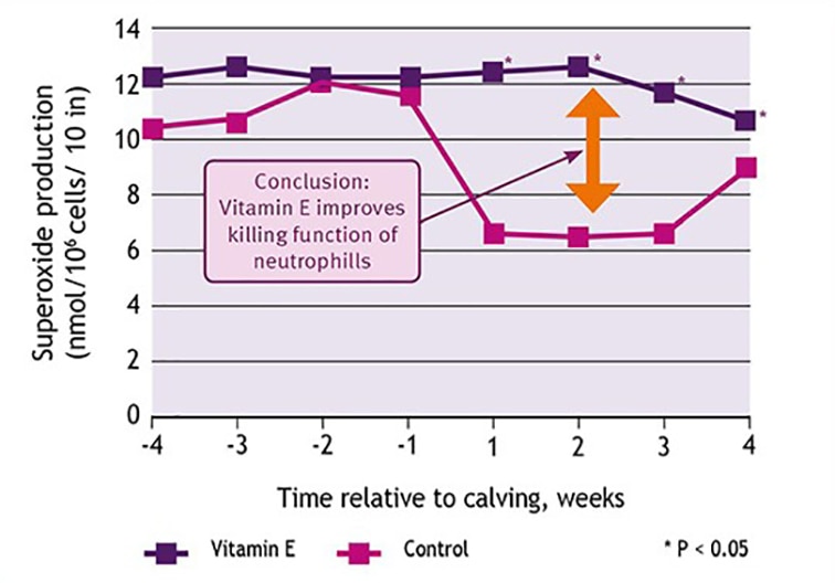 There is clear evidence that vitamin E blood levels in dairy cows are always comparatively low at times in the milking cycle when cattle are most susceptible to metabolic disorders. These disorders include the well-known milk fever at calving, but also infections and subsequent diseases. They all occur during the so-called per parturient or transition period that covers the last 10% of the gestation period and the first few weeks into lactation. It is also universally agreed that a component of this stressful time for the cow is a low level of immune response. Figure 1 shows that the neutrophil function is very much depressed around calving, putting cows at greatest risk of developing metabolic and/or infectious diseases after or during calving (Figure 2).