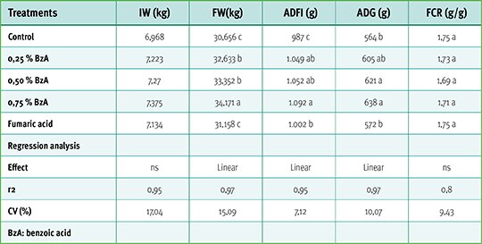 You cannot completely separate each of the actions and contributions of organic acids. The end result is nothing more than the sum of these various actions (action on microbiota, performance and buffering capacity) and then assess what is most important to choose the acid to be used. Gheler et al. (2005) conducted a comparative study of increasing doses of benzoic acid (0.25%, 0.50%, 0.75% diets until 70 days) compared to a negative control and to a positive control with fumaric acid (2% , 1.5%, 1% in the diet phase 1, 2 and 3, respectively). The study was conducted in the experimental facilities of the University of São Paulo, on the campus of Pirassununga. The results are shown in Table 2.