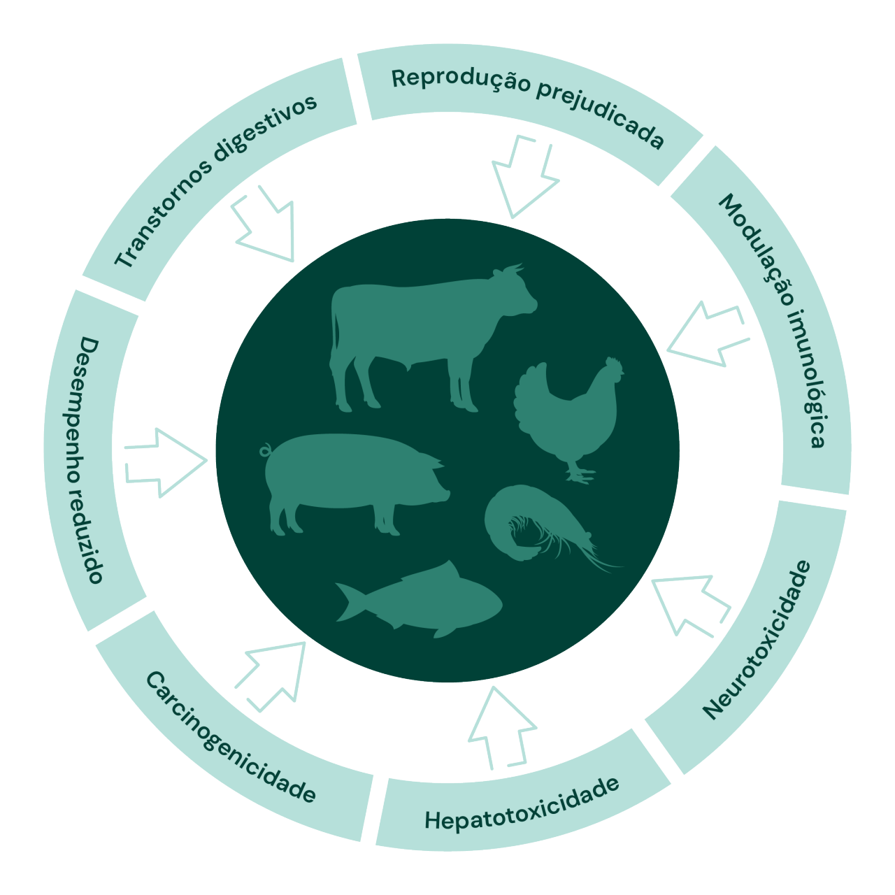 Efeitos negativos incluem desde problemas respiratórios, digestivos, imunossupressão, lesões hepáticas, diminuição do desempenho zootécnico, perda da performance reprodutiva, mortalidade, resultando na piora da eficiência econômica.