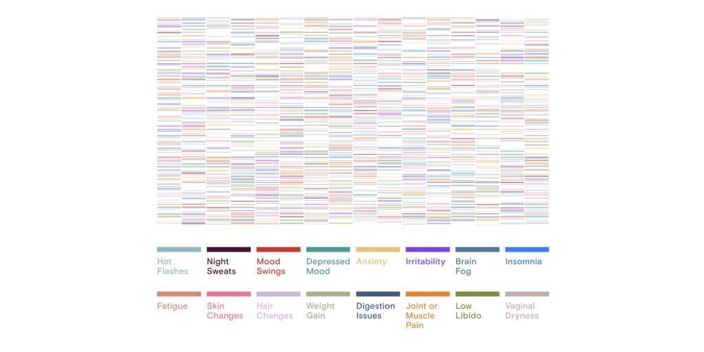 Most astonishing was the discovery of more than 15,000 unique menopause symptom signatures in the data set. In other words, among the 32,000 women surveyed, very few were likely to be experiencing the exact same set of symptoms out of a total of 16 symptoms measured.