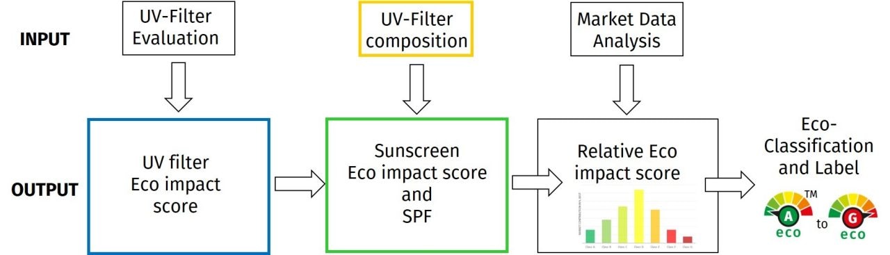 As part of a straightforward, three-step process, UV filters are first analyzed based on standardized eco-toxicological data to generate an individual environmental impact (EI) score. Users can then rate the overall impact of a sunscreen composed of multiple UV filters by accounting for the concentration and impact of each respective UV filter. This overall eco-score can then be translated into an eco-label by ranking the environmental sustainability relative to other marketed products with the same SPF labelled.