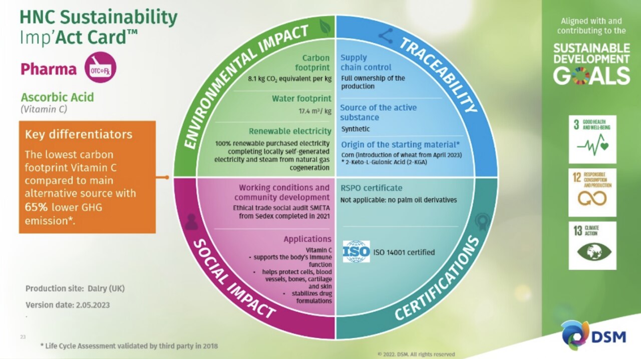 Por ejemplo, nuestra Imp'Act Card™ de ácido ascórbico (vitamina C) demuestra cómo esta solución pionera genera un 65% menos de emisiones de gases de efecto invernadero en comparación con ingredientes alternativos de vitamina C 4. La huella de carbono y la huella hídrica se calculan mediante nuestra Evaluación del Ciclo de Vida (ECV), que cuantifica el impacto medioambiental de un producto, tecnología o proceso a lo largo de todo su ciclo de vida, desde la extracción de la materia prima, pasando por la fabricación, el uso y la eliminación.